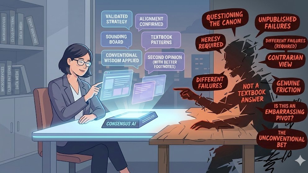 The more consequential the decision, the more this matters. Stress-testing an API design choice with an AI in Postman? Perfectly reasonable. Stress-testing the assumption that your organization should be betting on a particular technology platform for the next five years? You need someone whose priors were shaped by different failures than yours.